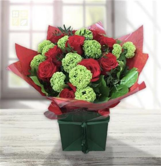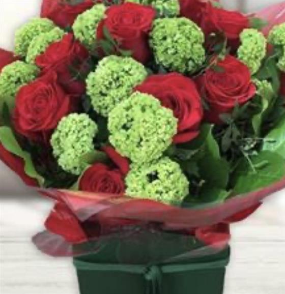 This bold bouquet pairs lush red roses with bright green viburnum snowballs and glossy foliage, beautifully presented in a box for a striking, joyful gift.