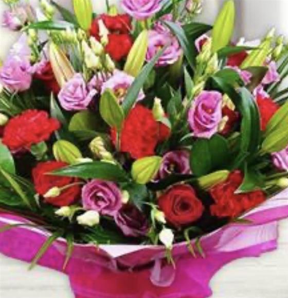 Blush pink lisianthus, scarlet carnations, deep-red roses and tender lilies nestle in verdant foliage, for a gentle, romantic flourish.